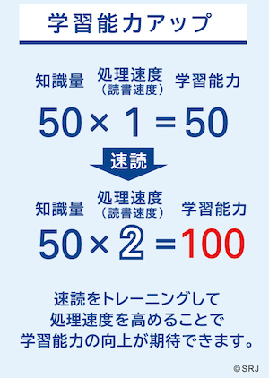 そこで!速読力をつけて同じ学習時間でチャッ!チャッ!と宿題も勉強もこなしちゃいましょう。速読力がつくと、処理速度が速くなる。同じ30分と言う時間でも、中身が変る。学習量が増え、高い学習効果が得られます。また、時間を有効に使えることで、反復学習の時間を確保することも可能になります。
